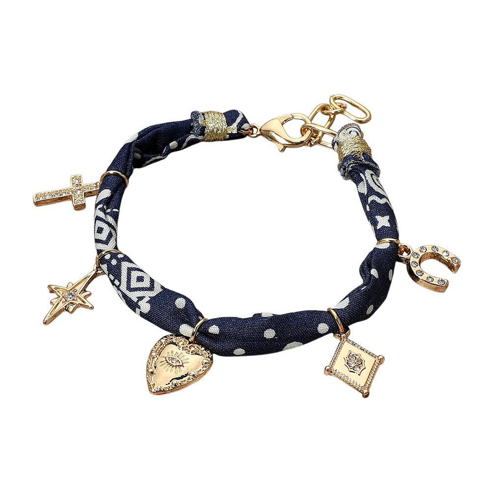 Bring festival magic to your look with this fabric-wrapped charm bracelet, featuring a lucky horseshoe, protective cross, and radiant North Star, a timeless symbol of guidance and finding your true path. Paired with a heart and medallion for love and strength, this bracelet is your festival talisman for good vibes and new adventures.