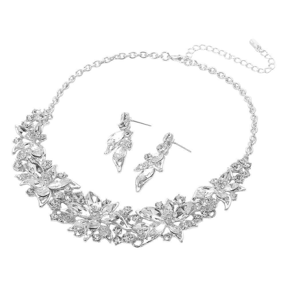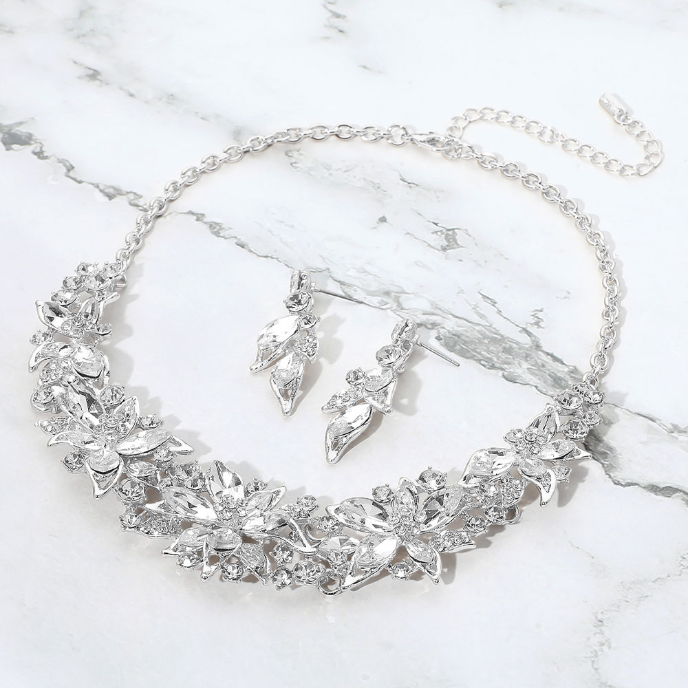 A breathtaking silver-plated jewellery set featuring a floral-inspired statement necklace paired with matching drop earrings. Each petal and crystal is arranged to catch the light beautifully, creating a radiant sparkle that feels both timeless and modern.