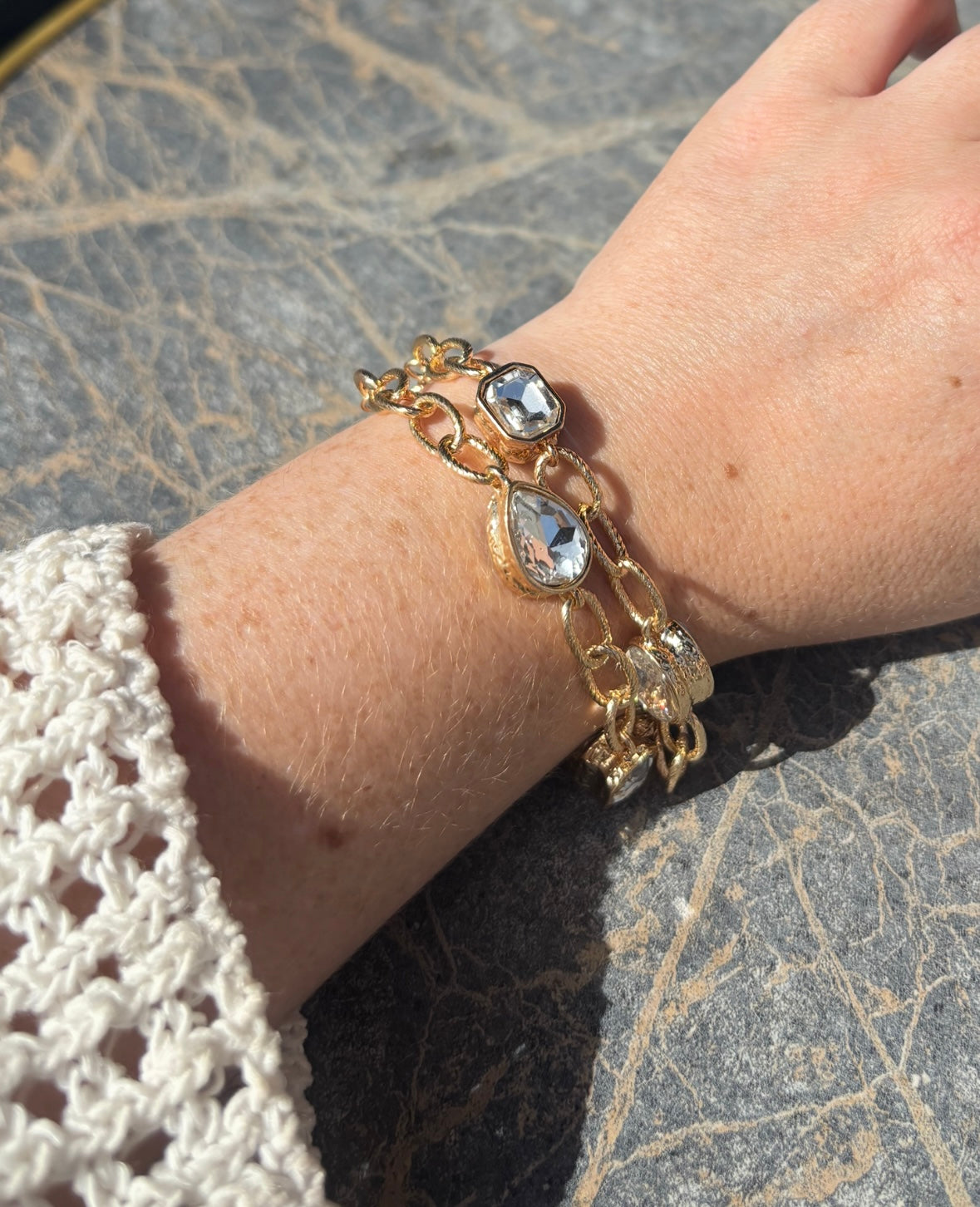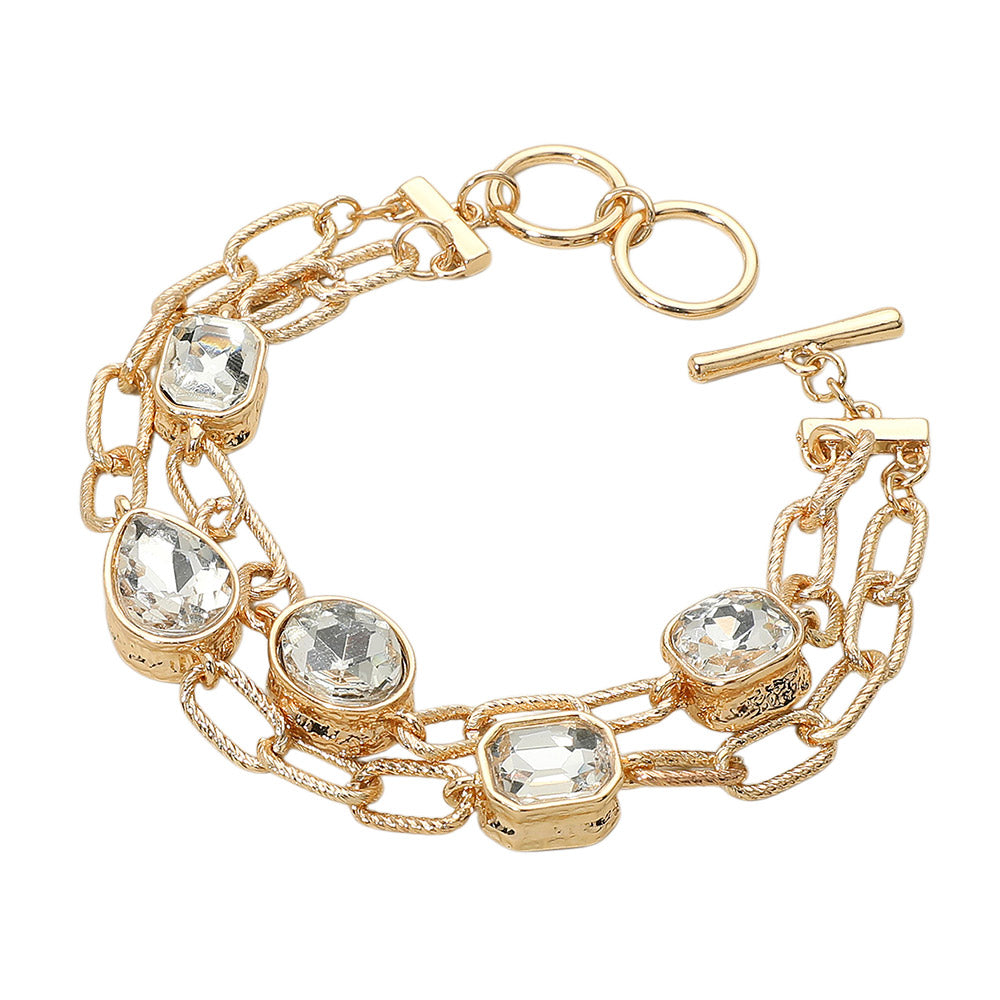 Stacked and shining, this bracelet is all about main-character energy. With textured gold chains and crystal cuts that hit every angle (oval, teardrop, square). Perfect for nights out, brunch fits, or whenever you want that effortless glam.