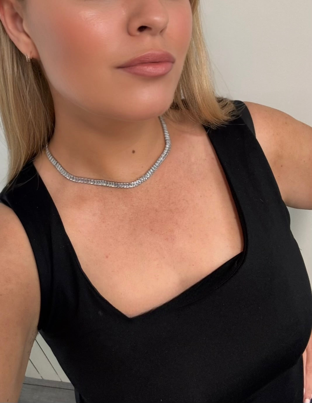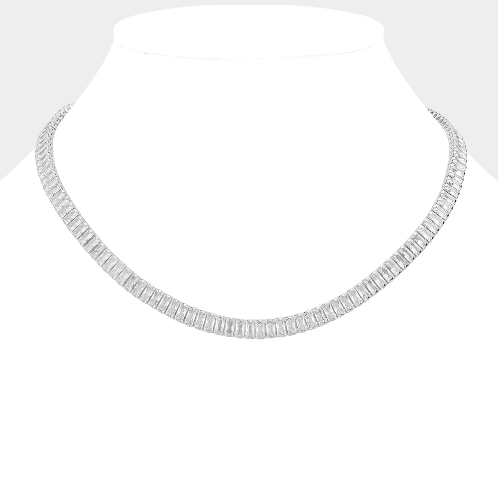 At 16" with a 2" extender, this necklace sits perfectly on the neckline, making it ideal for layering or as a standalone statement. The emerald cut stones add an elegant twist to the classic tennis design, catching the light from every angle.