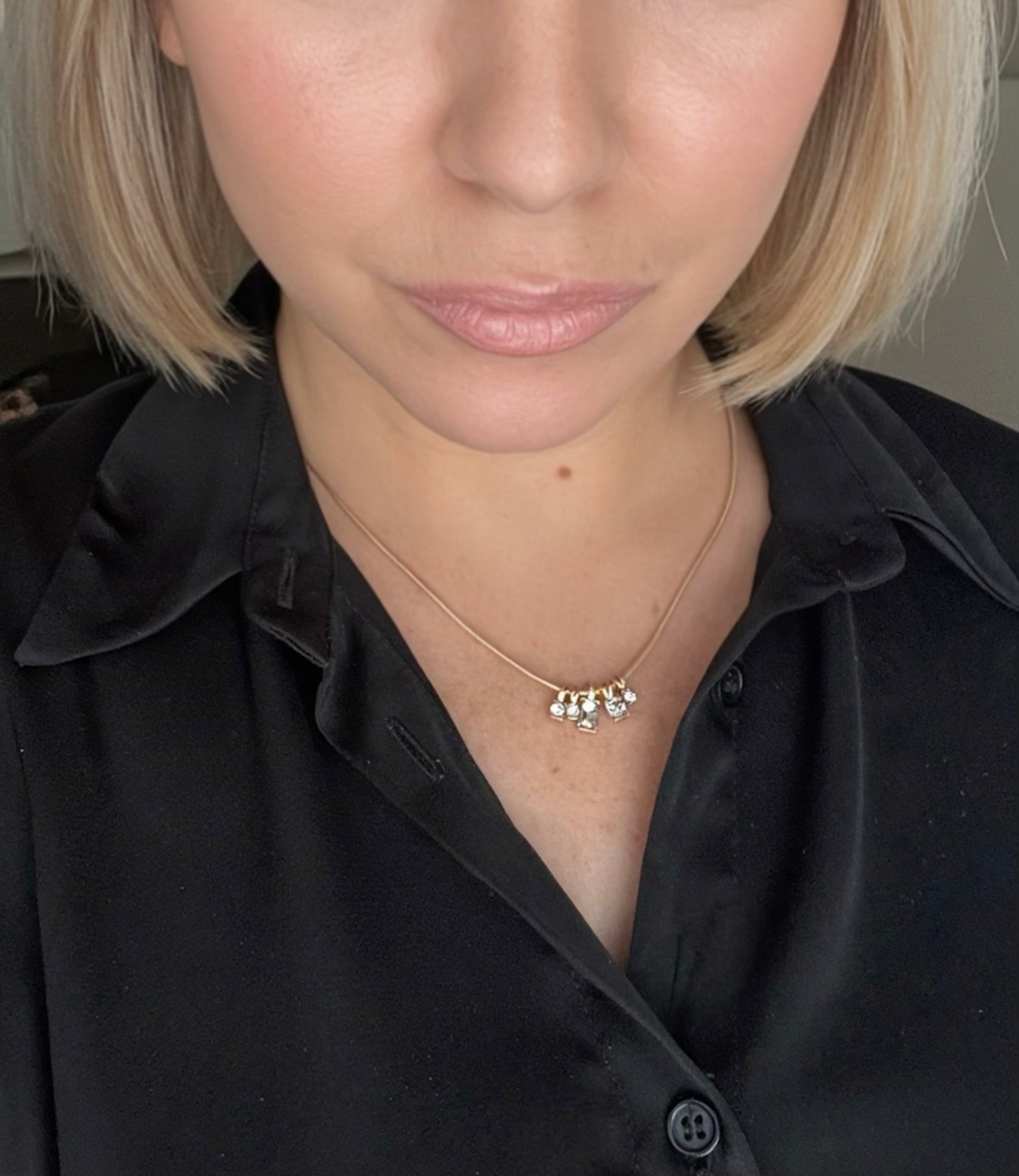 Minimalist yet striking, this necklace features a snake chain adorned with a cluster of sparkling stones. This design makes it perfect for layering or wearing solo as a refined statement. A versatile piece that transitions effortlessly from day to night.