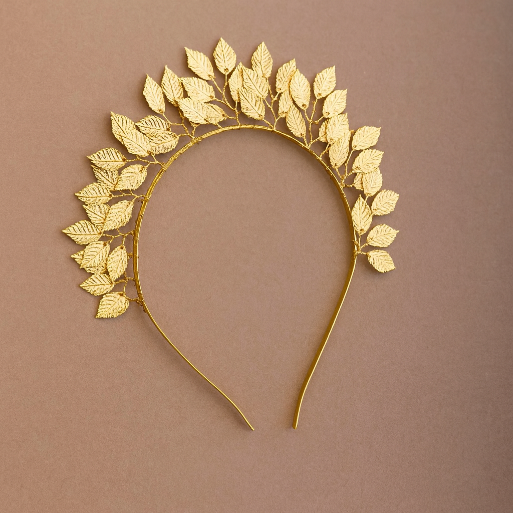 Channel timeless elegance with the Fionnuala Crown, a radiant gold leaf headpiece with delicately detailed golden leaves, this versatile crown is designed for modern goddesses who want to make a statement.
